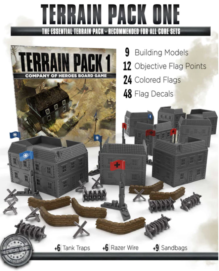 The most popular and essential Terrain Pack from First Edition; TP1 provides the most bang for your buck by transforming the map boards with beautiful and functional building models, satisfying control point capture flags, and constructible field defenses pre-stretched from the first campaign.