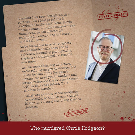 • Play detective to crack this gripping murder mystery game, and bring the criminal to justice - A murder has been committed in a small port town on Fidalgo Island in America’s Pacific Northwest. Movie Theater owner - Chris Hodgson - was found dead in his office with multiple lacerations to the chest..