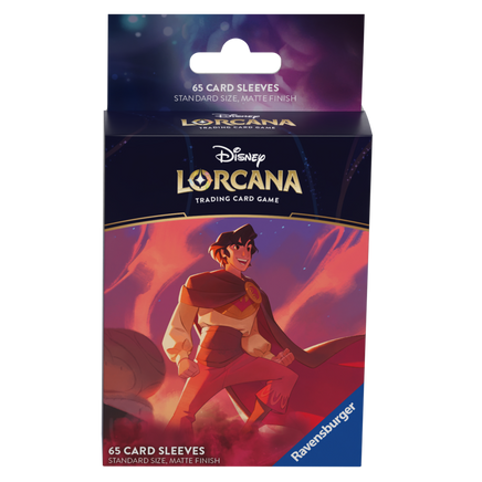 A set of 65 card sleeves for Disney Lorcana with a print of Aladdin Heroic Outlaw from Shimmering Skies.