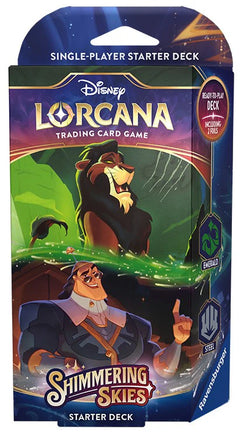 Two starter decks are available for the Disney Lorcana TCG set Shimmering Skies. Each prebuilt deck has 60 cards and features cards from two inks, each with distinct play styles. The two ink combinations are Amethyst & Ruby and Emerald & Steel. Each starter deck also includes a booster pack of 12 cards to start your collection.