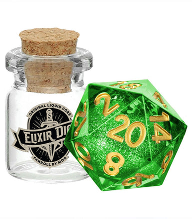 Elixir  dice are infused with glittery liquid cores that swirl when rolled. Each set is handcrafted and polished to keep their beautiful sharp edges. When the liquid cores are molded into the dice, the heat from molding creates a small bubble in the liquid core.