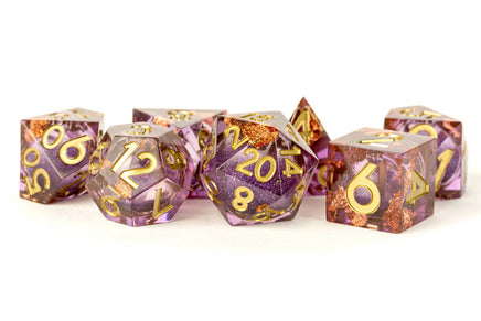 From our innovative Kickstarter, Elixir dice are infused with glittery liquid cores that swirl when rolled. Each set is handcrafted and polished to keep their beautiful sharp edges. When the liquid cores are molded into the dice, the heat from molding creates a small bubble in the liquid core. Since the bubble in the liquid is constantly moving, we have not seen an effect on rolling. Sharp edge d4’s have small liquid cores that are more difficult to center, but we have not seen an effect on rolling. These full-sized polyhedral dice sets come with 7 dice (d4, d6, d8, d10, d10%(00-90), d12, and d20).