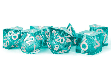 Elixir dice are infused with glittery liquid cores that swirl when rolled. Each set is handcrafted and polished to keep their beautiful sharp edges. When the liquid cores are molded into the dice, the heat from molding creates a small bubble in the liquid core. Since the bubble in the liquid is constantly moving, we have not seen an effect on rolling. Sharp edge d4’s have small liquid cores that are more difficult to center, but we have not seen an effect on rolling. These full-sized polyhedral dice sets come with 7 dice (d4, d6, d8, d10, d10%(00-90), d12, and d20).