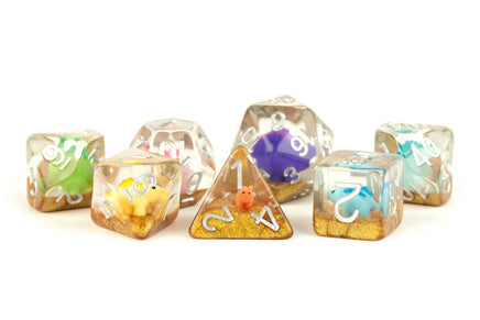 Dinosaur dice are infused with miniature dinosaurs! These are full-sized 16mm polyhedral dice sets that come with 7 dice (d4, d6, d8, d10, d10%(00-90), d12, and d20).
