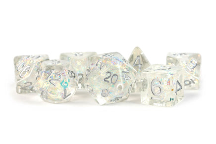 Rainbow Frost dice are infused with holographic paper that shimmers in the light. These are full-sized 16mm polyhedral dice sets that come with 7 dice (d4, d6, d8, d10, d10%(00-90), d12, and d20).