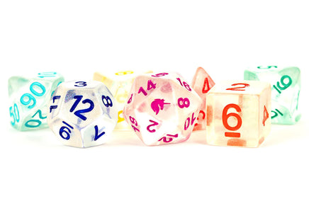 Unicorn dice are a beautiful mix of transparent resins, which are then infused with prismatic glitter dust that changes from blues to purples to greens as it hits the light. Each 16mm polyhedral set comes with 7 dice (d4, d6, d8, d10, d10 (00-90), d12, and d20).