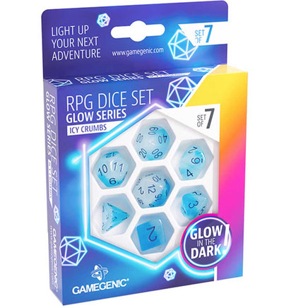 Choose your weapon! This dice set contains a D4, a D6, a D8, two D10 (10 and 00), a D12 and a D20. All dice are round-cornered and manufactured at a premium level. The dice from the Glow dice set glow in the dark and won't let the light go out on your adventure.