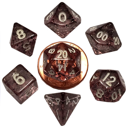 Perfect for gaming anywhere, anytime! At 10mm, these mini dice sets easily fit in your pocket so you can bring your dice everywhere you go. Each polyhedral set comes with 7 dice (d4, d6, d8, d10, d10 (00-90), d12, and d20).