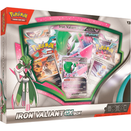 Awakening from a long-gone world is the ferocious Roaring Moon ex—while the resilient Iron Valiant ex beams in from the future! In this box, you get a promo card and an oversize card featuring either Roaring Moon ex or Iron Valiant ex. Roaring Moon ex is joined by Brute Bonnet and an Ancient Booster Energy Capsule, and Iron Valiant ex comes with Iron Moth and a Future Booster Energy Capsule—all things that your past self would want you to have to help you out in the future. Find even more helpful allies in the included Pokémon TCG booster packs!