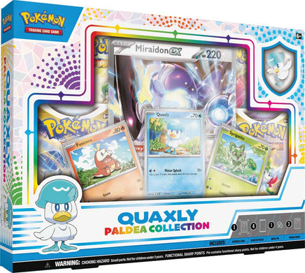 Get ready for a brand-new adventure in the Paldea region with the Pokémon Trading Card Game! First partner Pokémon Sprigatito, Fuecoco, and Quaxly join your collection as foil promo cards, and an enamel pin lets you show off your chosen Pokémon everywhere you go. Discover even more with booster packs and an oversize card featuring the Legendary Pokémon Koraidon or Miraidon as a powerful Pokémon ex!