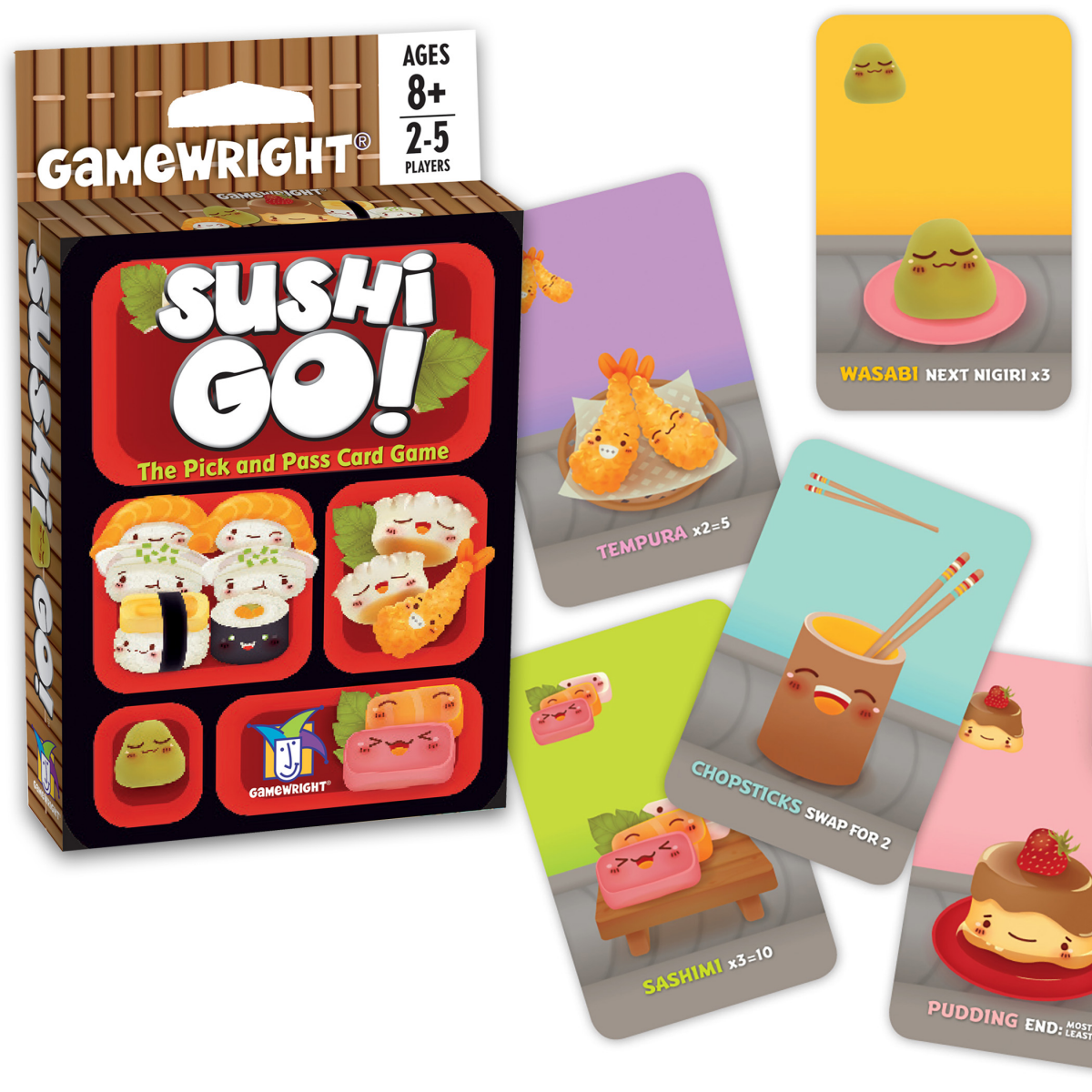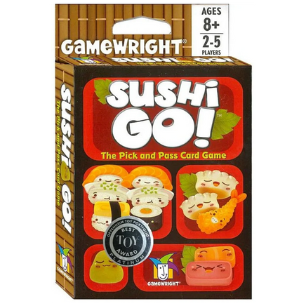 In the super-fast sushi card game Sushi Go!, you are eating at a sushi restaurant and trying to grab the best combination of sushi dishes as they whiz by. Score points for collecting the most sushi rolls or making a full set of sashimi. Dip your favorite nigiri in wasabi to triple its value! And once you've eaten it all, finish your meal with all the pudding you've got! But be careful which sushi you allow your friends to take; it might be just what they need to beat you!