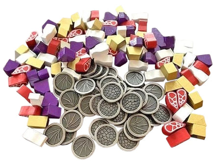 These 45 metal coins and 104 wooden resource tokens were designed specifically for Wyrmspan (the game includes cardboard tokens). All metal coins are identical, and there are 26 each of the resource tokens: meat, gem, gold, and milk.