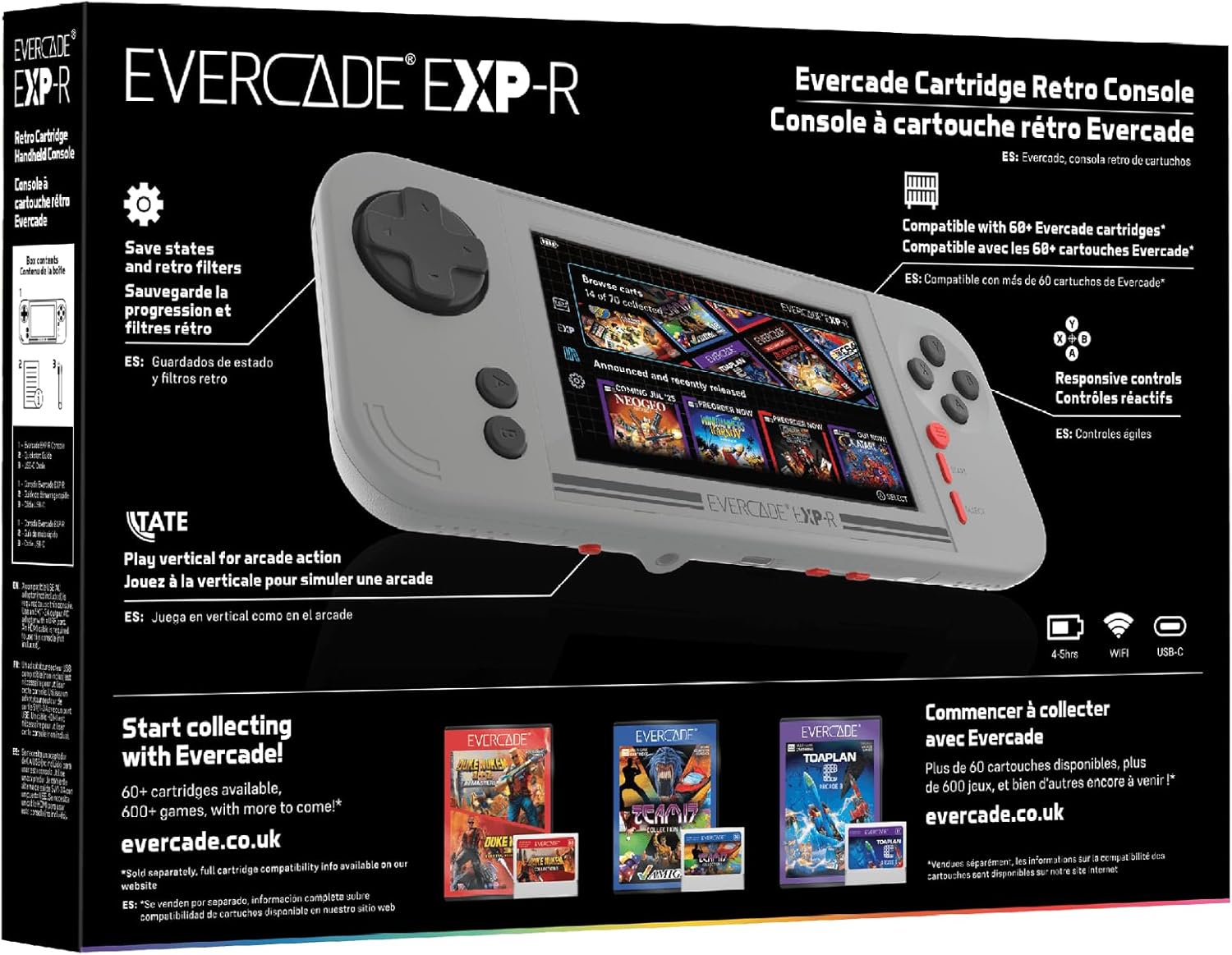 - Evercade EXP-R Solo delivers classic retro gaming on the go. New design with light grey casing with dark grey and red accents.