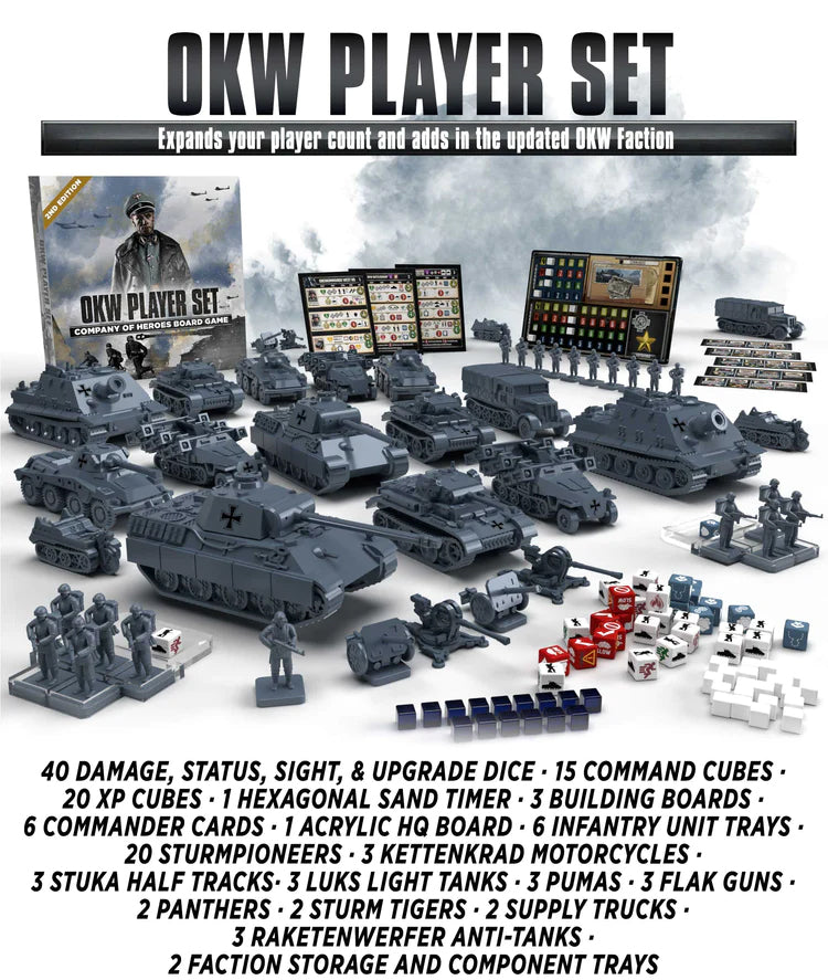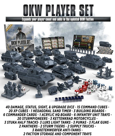 The Oberkommando der Wehrmacht (OKW; Wehrmacht High Command) Faction Player Set includes all of the components to add an additional player, like command cubes, dice, infantry trays and more. To expand the 2 Player Core Set to include more players, grab a Faction Player Set for each additional player.