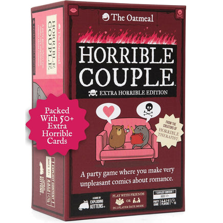 Horrible Couple Extra Horrible Edition is the even more deplorable version of an unfiltered couples card game about love, laughs, and terrible decisions. Created by The Oatmeal and Exploding Kittens, this edition has plenty of extra horrible cards to turn romance into ridiculous three-panel comics where the best (or worst) punchline wins. You can play cooperatively to test your connections or competitively to see who comes up with the funniest ending. With 2 - 8 players recommended you can invite other friends or couples to make their own horrible comics. Fast, easy, and endlessly replayable, Horrible Couple is the marquee comic strip like card game that can be enjoyed or gifted to anyone with a dark sense of humor.