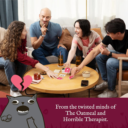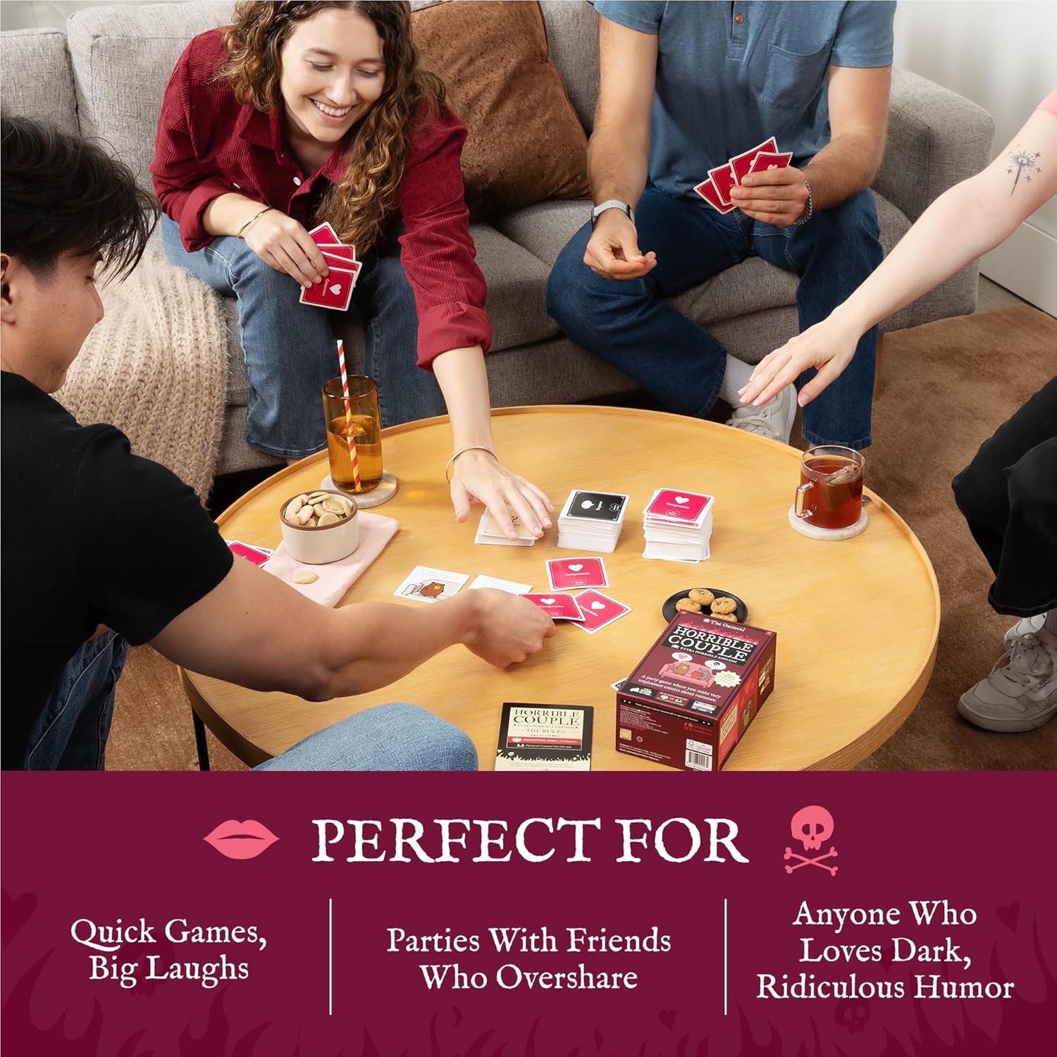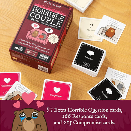 • How To Play: You'll compete to create a love story fit for a classic dark comedy. In the Extra Horrible Edition, you’ll have more material than ever to create distasteful comics starting with a Question card, then a Response card, and topped off with a ludicrous Compromise card. Play as a couple or with friends, cooperatively or competitively. Nothing says date night like a little chaos!