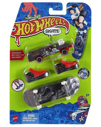 Embrace the full Hot Wheels Skate experience with this sweet set that includes a fingerboard and skate shoes plus one Hot Wheels vehicle (1:64 scale). The collection was designed in collaboration with skateboarding legend Tony Hawk, and each set has matching details featuring metallic board graphics and an exclusive Hot Wheels vehicle. The removable shoes help kids get the feel of the board as they experiment with ollies, jumps and 360s over the included Hot Wheels vehicle. Groms will shred like pros in no time as they master their stylish stunts just like Tony Hawk! Kids and collectors will want each set of boards, shoes and cars with their premium design execution. Each sold separately, subject to availability. Colors and decorations may vary.