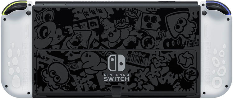 This Nintendo Switch system takes on a totally fresh look from the new Splatoon  game. Ink up the Splatlands in style with this Splatoon themed Nintendo Switch – OLED Model system! Fresh features include; blue and yellow gradient Joy-Con controllers with a white underbelly, a white dock adorned with graffiti, and a splat-tastic design on the back of the system.