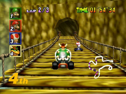 Three... Two... One... GO! The signal light changes and you drop the pedal to the metal. Take on up to three friends in the split-screen VS games, or race solo in the Mario GP. Tell your friends to bring it on in the highly competitive Battle mode. Advanced features allow you to race with your Ghost. The driving data from your best run appears as a transparent character on the screen. No longer must you simply race against the clock - you can actually race against yourself!
