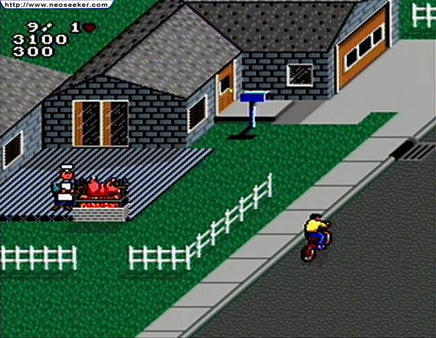 Rise and shine, bud! A great day's ahead, just waiting for you to become the neighborhood's terror of a paperboy. but it's a whole new job with double the fun and twice the excitement! That's right, you've now got houses on both sides of the street - which means even more customers' homes to deliver papers to and non subscribers' homes to damage. It also means you've got to watch out for lots more obstacles and meanies that are out to knock you off your bike! Wreak mischief across the town or do good deeds like saving the baby and stopping the burglar. At the end of the day, hone your skills on the all-new BMX-style test course. Add the new awesome graphics, and you're in for a rip roaring time on your bike!