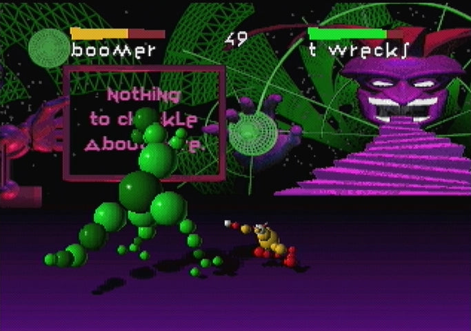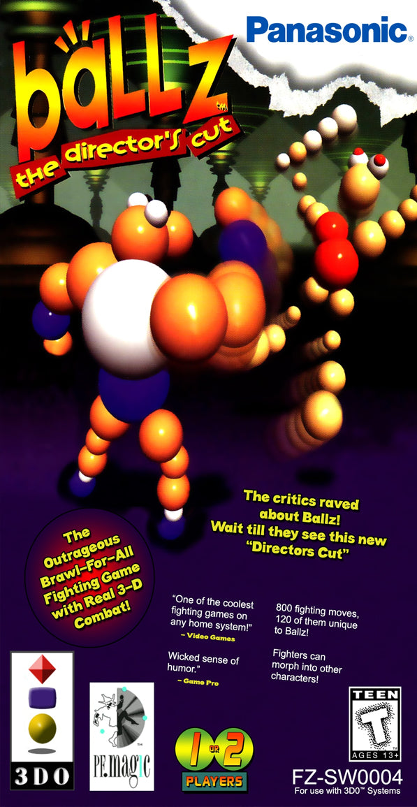 You wanna fight? Jump in the arena and take your chances with some of the toughest and funkiest fighting characters around. With the new Director's Cut, you're in for the ride of your life. This ain't no sissy 2-D combat - no side-scrolling suckers allowed! We've got a true 3D arena with 360 degrees to attack from. Attack from the air, shoot projectiles and sneak around your opponent to jump on his back. To succeed in 3D, you gotta have brains and brawn. But most importantly, you gotta have Ballz. You play Ballz in a high-tech cyberworld run by the Jester - the sultan of insultin' who's gonna toy with you till you cry. He has nine hilarious and vicious characters plus eight killer bosses. The gruesome character, Zombie, is new to the Director's Cut. Each character has the ability to morph into any other character - at any time! Over 3 times the special moves per character than flat games!