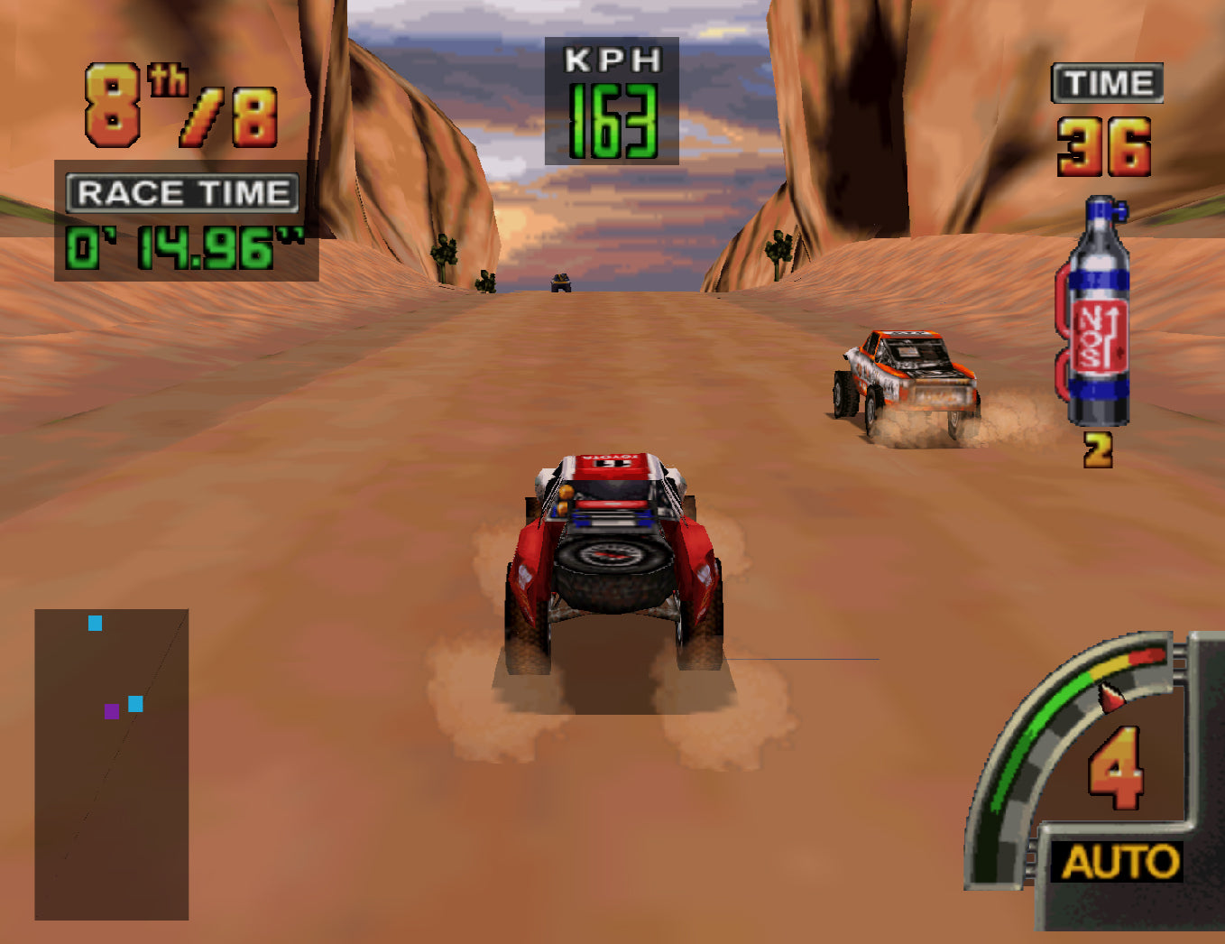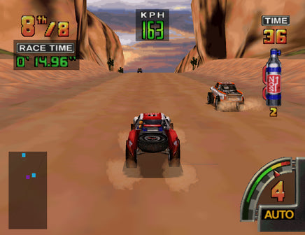 The END of the ROAD is only the BEGINNING. Strap yourself in and get ready to ride! Players battle the elements and each other in a race that takes them across 6 rugged courses including the Mojave Desert, Las Vegas and Pike's Peak! Choose Circuit Mode and climb your way to the top of the heap. Course terrain includes snow, water, asphalt, dirt, sand, rocks and mud. Four selectable trucks and four hidden trucks. Players can customize trucks in the Speed Shop.