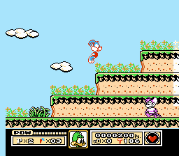 These Tiny Toons have big problems. That's right. The arch enemy of Acme Acres, Montana Max, has kidnapped the ever-so-popular Babs Bunny. Now the furry female's fate rests in the paws of Buster Bunny and his crime fighting pals - Dizzy Devil, Furrball and Plucky Duck. Four kooky buddies with their own special talent. Buster can bounce over bad guys with the best of them. Furrball uses his feline claws to climb walls. Dizzy Devil prefers to spin through them. And Plucky can glide through the air and swim like a fish. Choose which partner you want at the beginning of each level before you face-off against time and goofballs gone bad in 6 zany wonderlands. So you better get jumping or it will be curtains for our playful pals!