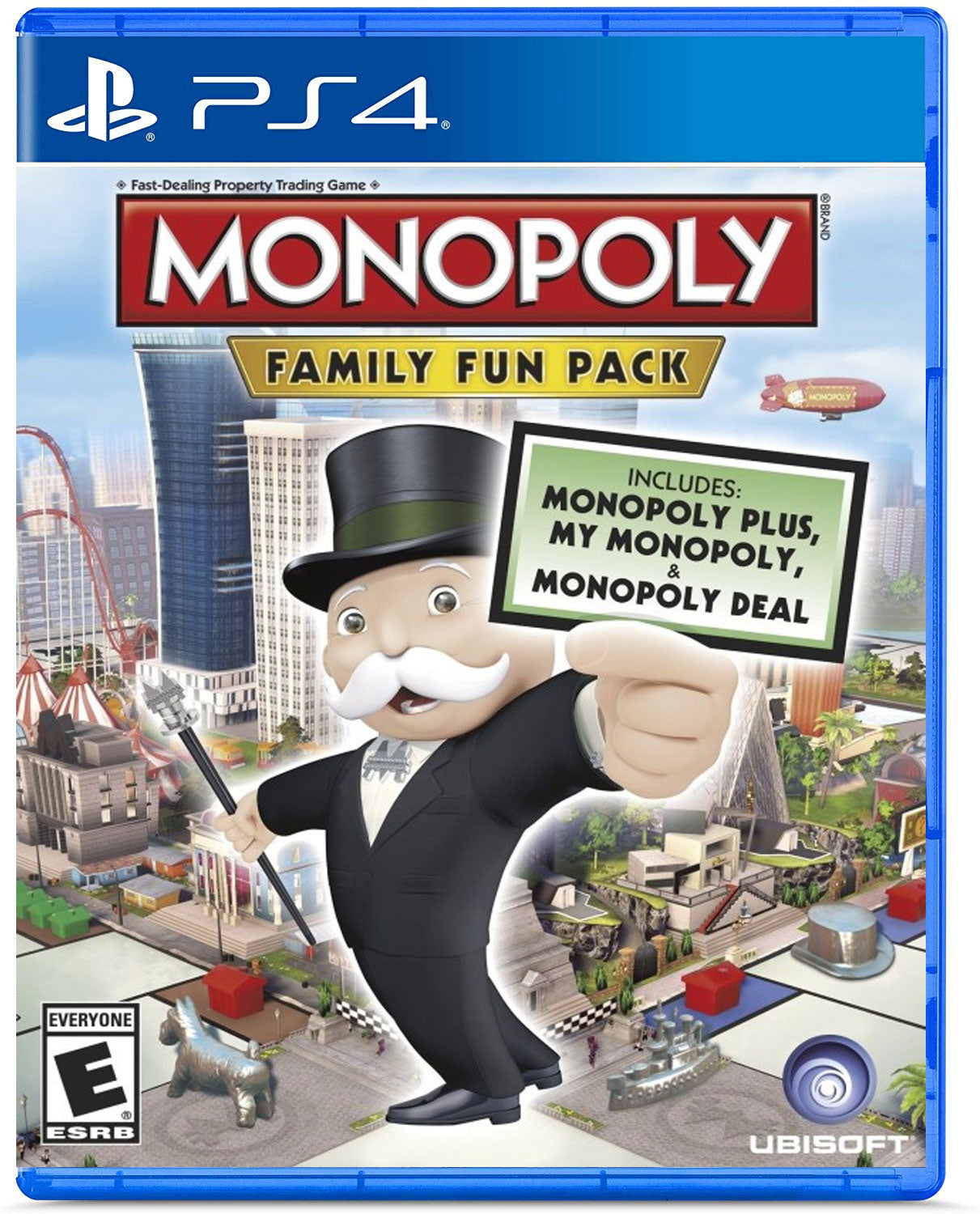 Monopoly for home consoles! The Monopoly Family Fun Pack gathers the 3 Monopoly Games: - Monopoly PLUS: the classic Monopoly with a 3D animated board! - My Monopoly, to create your very own board - Monopoly Deal, a fast-paced and addictive Monopoly card-game Enjoy the classic Monopoly in new fun ways, with your friends and people all around the world!