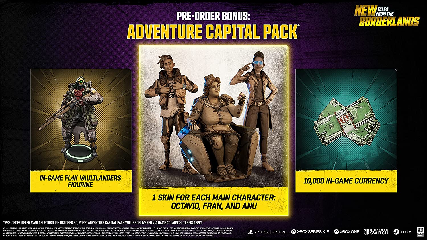 Pre-order to get the Adventure Capital Pack, featuring cosmetics for Anu, Octavio, and Fran, 10,000 in-game currency and an in-game FL4K Vaultlander collectible! (code in box)
