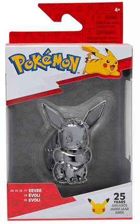 Celebrate the 25th Anniversary of Pokémon with this special Anniversary Silver Jigglypuff Figure! For over 25 years, Eevee has been the favorite Pokémon of Trainers all over the world and now this all-star Pokémon has been immortalized in a special Silver material! With incredible detail that looks like it has jumped right from the Pokémon Animated Series, this Silver Eevee figure is the perfect gift for Pokémon fans of all ages! For display usage only. Gotta Catch 'Em All!
